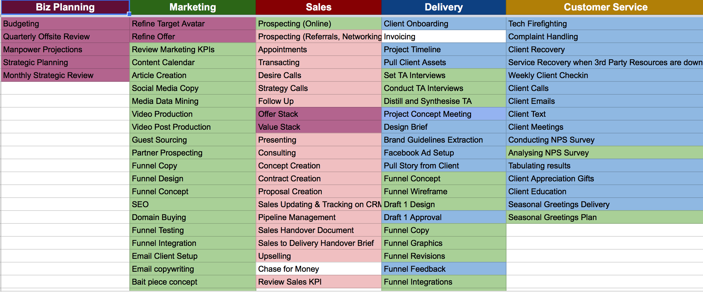 The list goes on and once you’ve gotten as much as you can (you won’t have it all nailed down) then you start to assign ownership to each of the tasks. Now just because a task is under Sales, doesn’t mean it must be done by someone in the sales team. So we would then colour co-ordinate each task based on which core activity owner it should be.